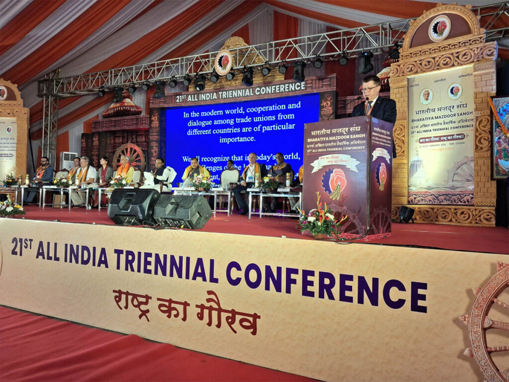 В эти дни делегация национального профцентра Беларуси во главе с председателем ФПБ Юрием Сенько принимает участие во Всеиндийской конференции Индийского рабочего союза и Международном симпозиуме, на котором обсуждается роль профсоюзов в условиях изменения глобального рынка труда